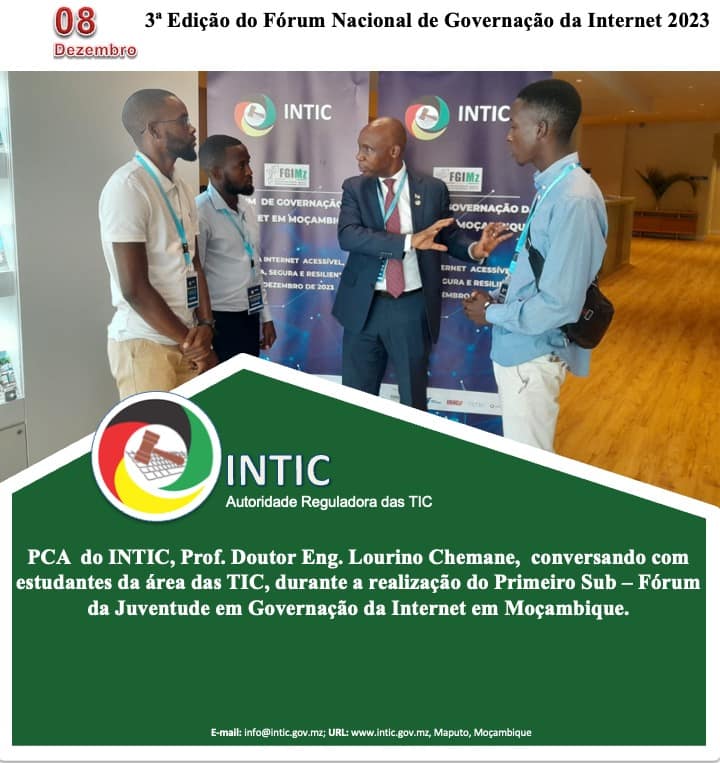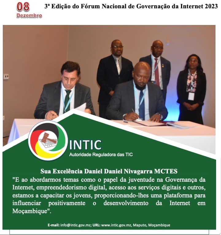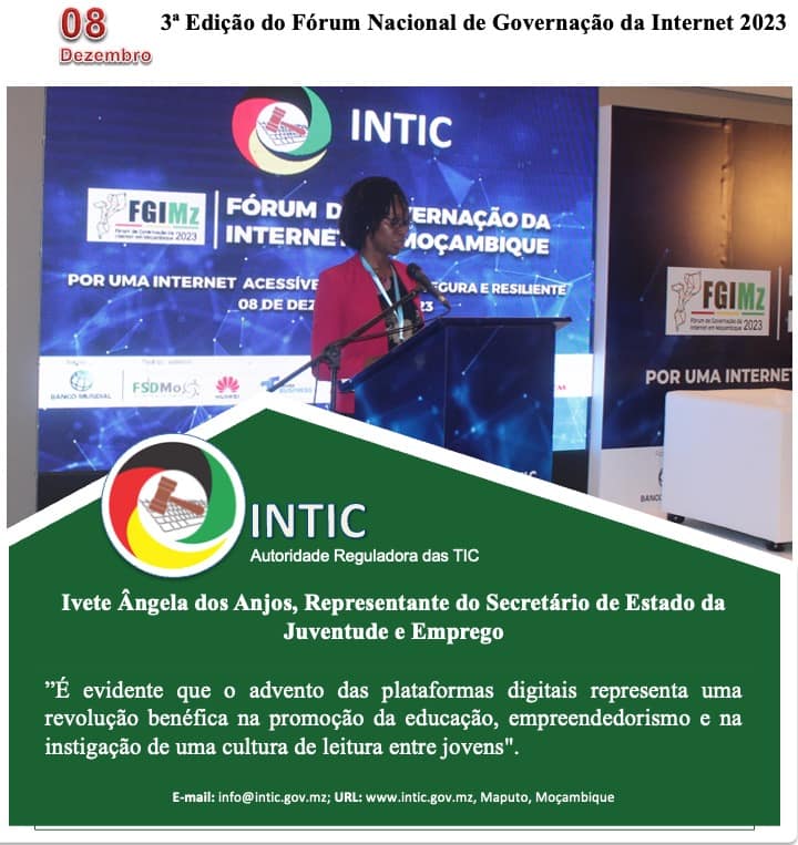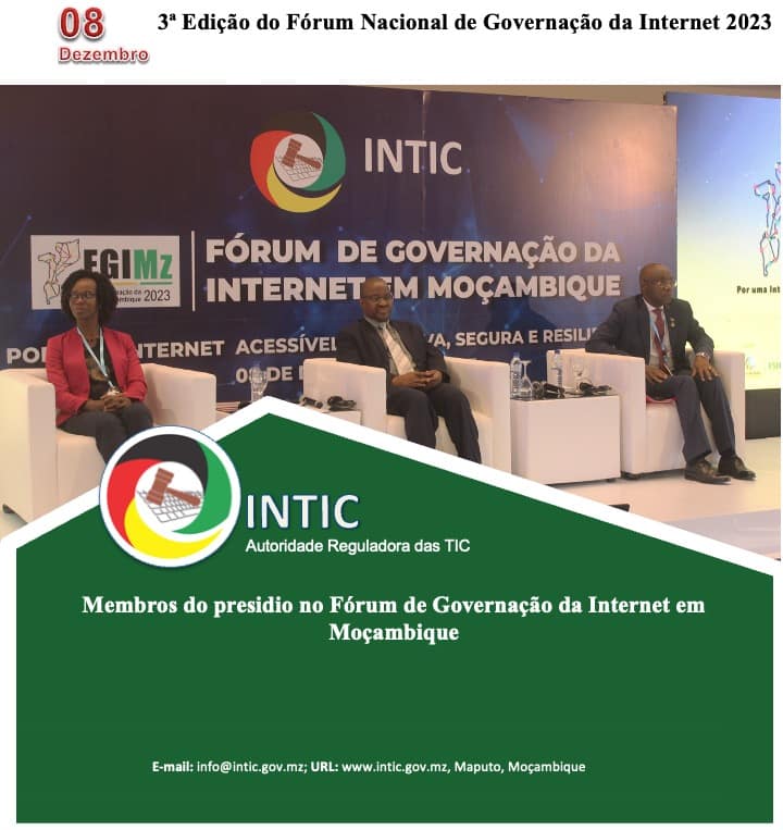 Decorre hoje, 08 de Dezembro de 2023, no Montebelo Indy Congress Hotel, na Cidade de Maputo, a 3ª Edição do Fórum Nacional de Governação da Internet 2023 (FGIMz2023) em paralelo com o 1o Sub-Fórum da Juventude em Governação da Internet emMoçambique (yFGIMz) em formato híbrido (presencial e virtual).