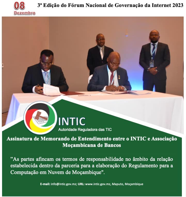 A cerimonia de abertura culminou com a assinatura do Memorando de Entendimento entre o INTIC e a Associação Moçambicana de Bancos, em que as partes vêm afincar os termos de responsabilidade individualizados no âmbito da relação estabelecida dentro da parceria para a elaboração do Regulamento para Computação em Nuvem de Moçambique.
